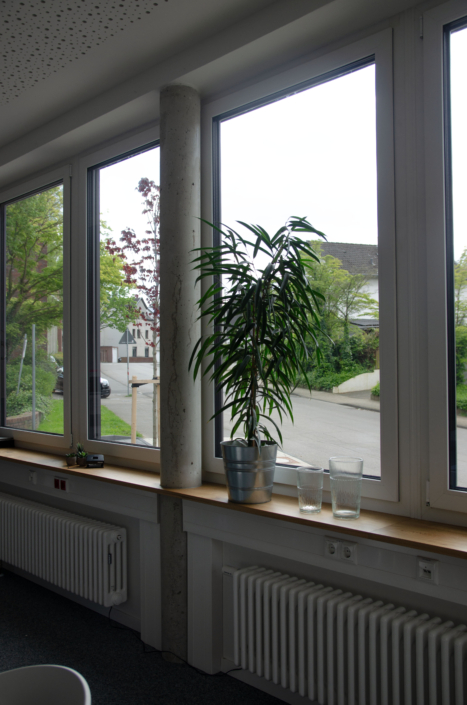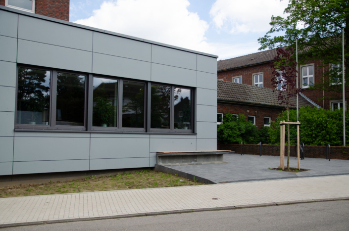 Eine Sitzbank im Außenbereich bietet nicht nur den Lehrenden, sondern auch den Schülerinnen und Schülern eine praktische Sitzmöglichkeit. Diese Qualität spiegelt sich auch im Innenraum wider, wo eine niedrige Fensterbank zum Verweilen einlädt und einen ungehinderten Blick nach draußen ermöglicht.