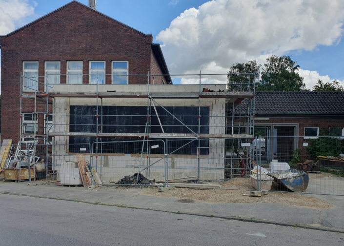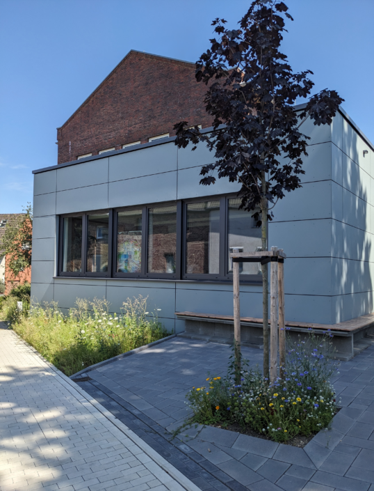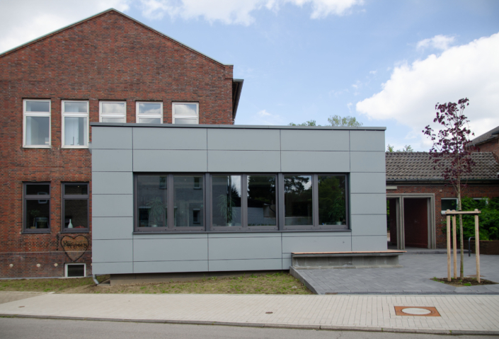 Der bestehende Klinkerbau der Grundschule in Würselen Scherberg wurde um einen neuen Anbau, als Aufenthaltsraum für die Lehrerinnen und Lehrer, ergänzt.