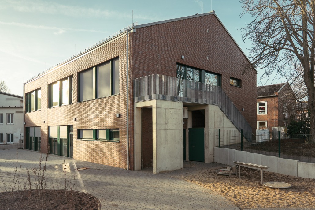 Die Fassade aus Klinkern im Märkischen Verband fügt sich harmonisch in das Ensemble der Bestandsgebäude ein und gewährleistet gleichzeitig eine lange Lebensdauer. Eine nachhaltige Energieversorgung wird durch Fußbodenheizung in Kombination mit Wärmepumpe und einer PV-Anlage auf dem Dach umgesetzt.