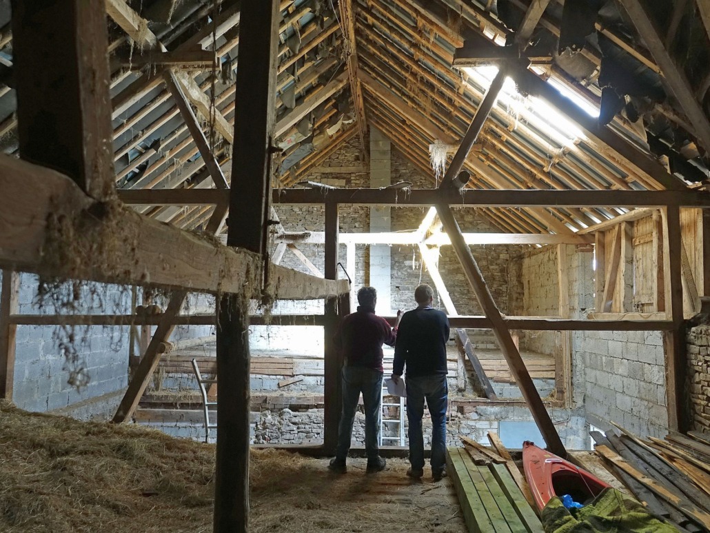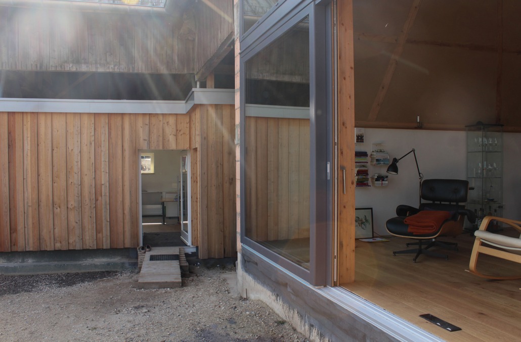 Die Nebengebäude bleiben in ihrem Bestand erhalten. Unter dem großen Scheunendach wird ein eigenständiger hölzerner Baukörper eingeschoben, der eine barrierefreie Einliegerwohnung aufnimmt.