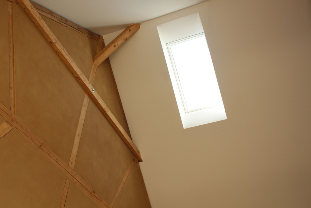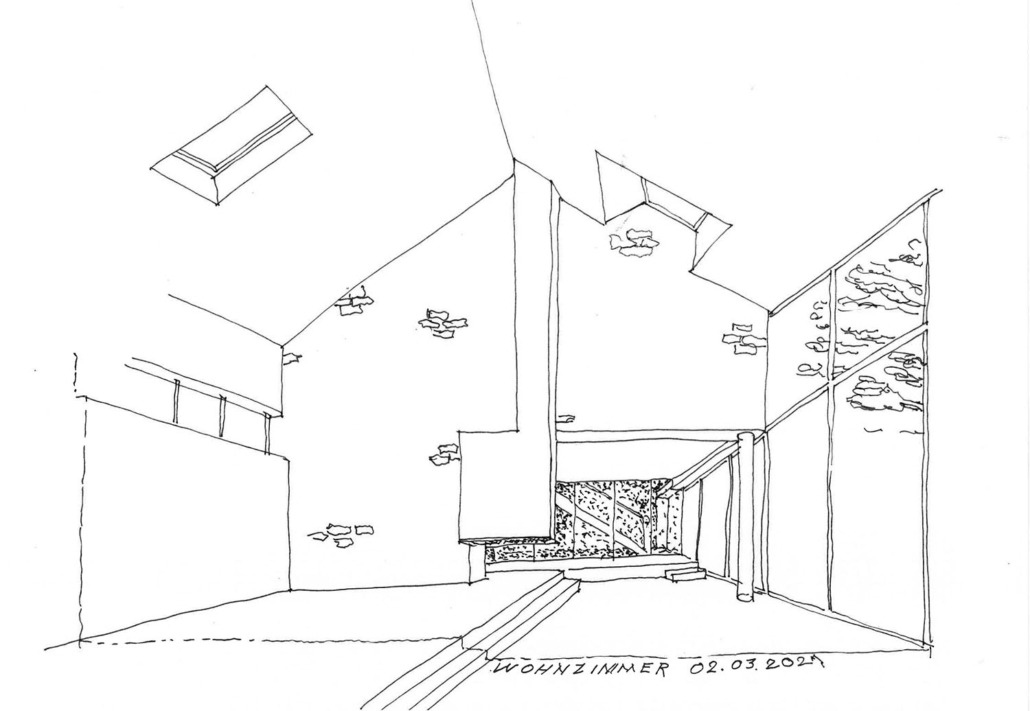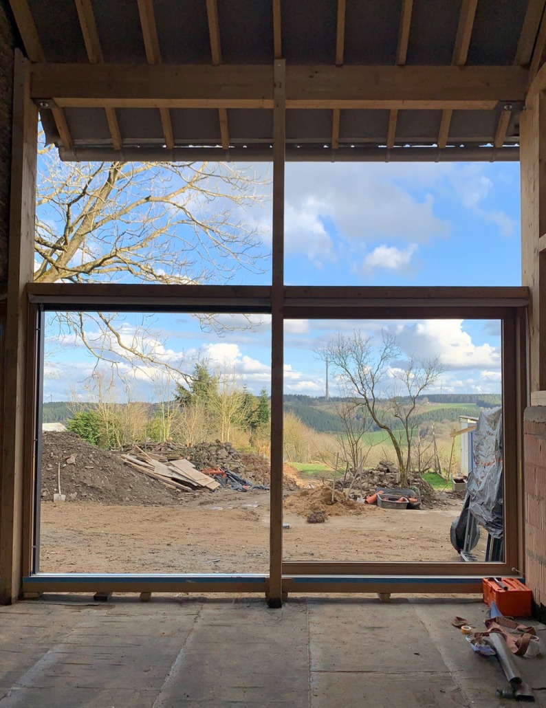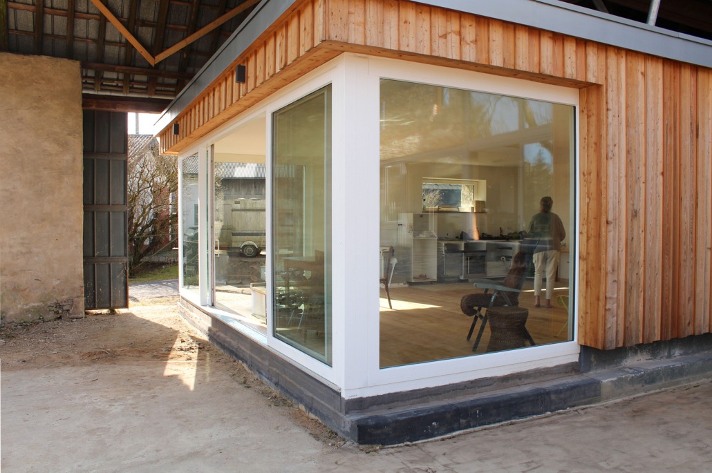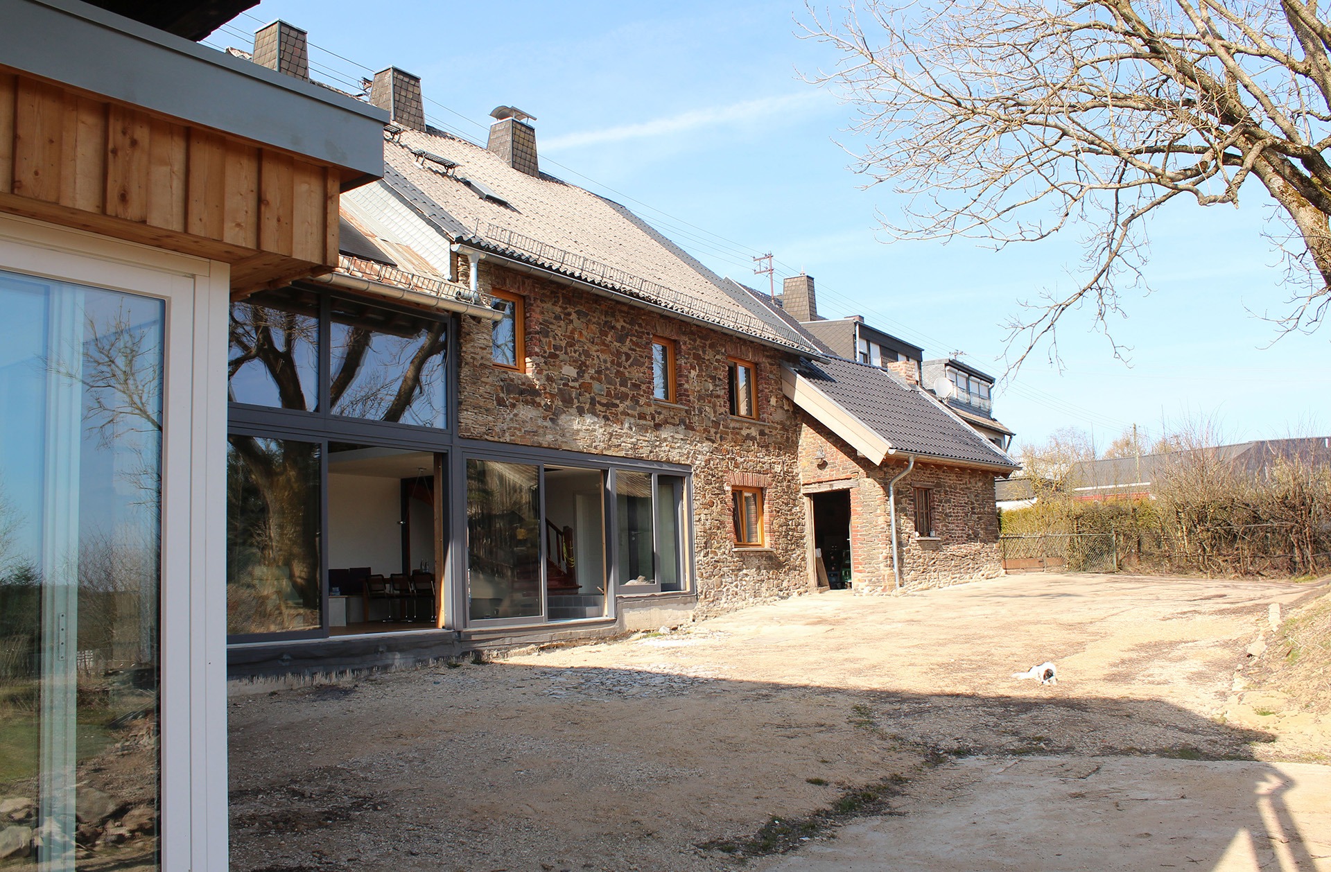 Durch das Öffnen eines Teils der rückwärtigen Fassade und einen Durchbruch zur angrenzenden Scheune wird zusätzlicher Wohnraum geschaffen. Eine großzügige Verglasung öffnet den Blick in die abfallende Landschaft und verbindet den Innenraum mit dem Hof und seinem prägenden Mittelpunkt: der alten Esche.