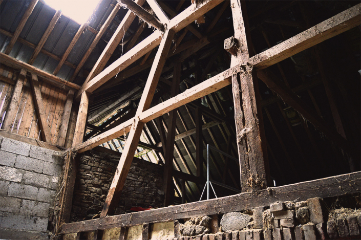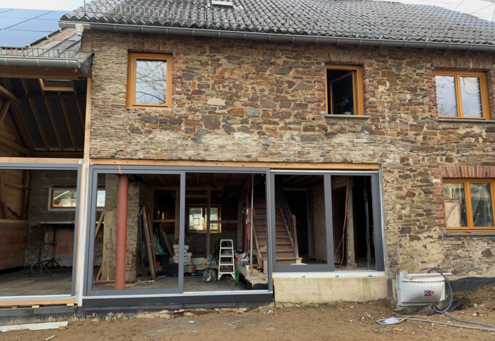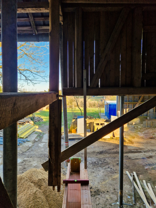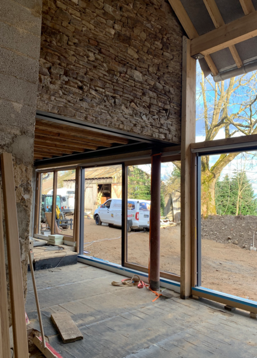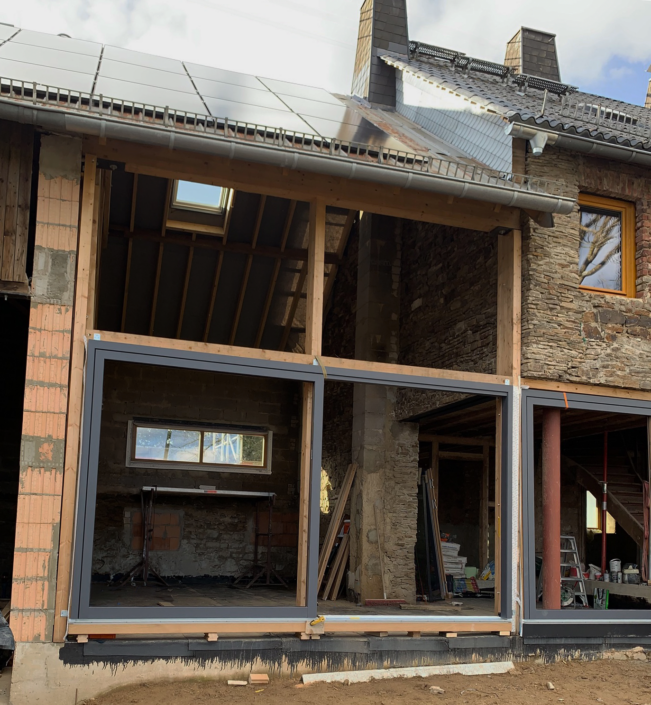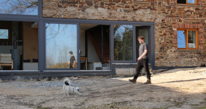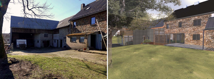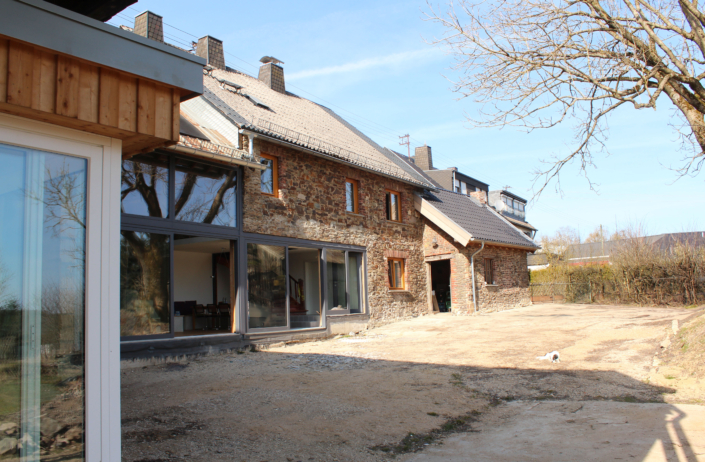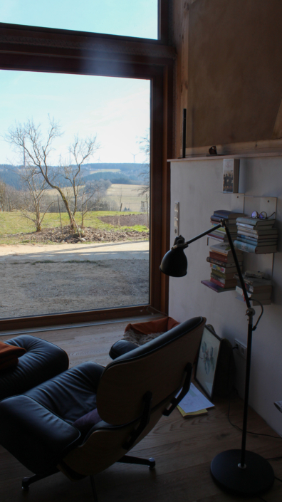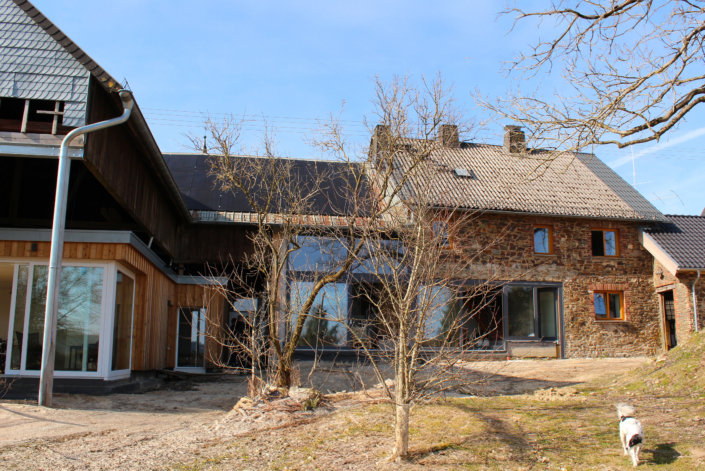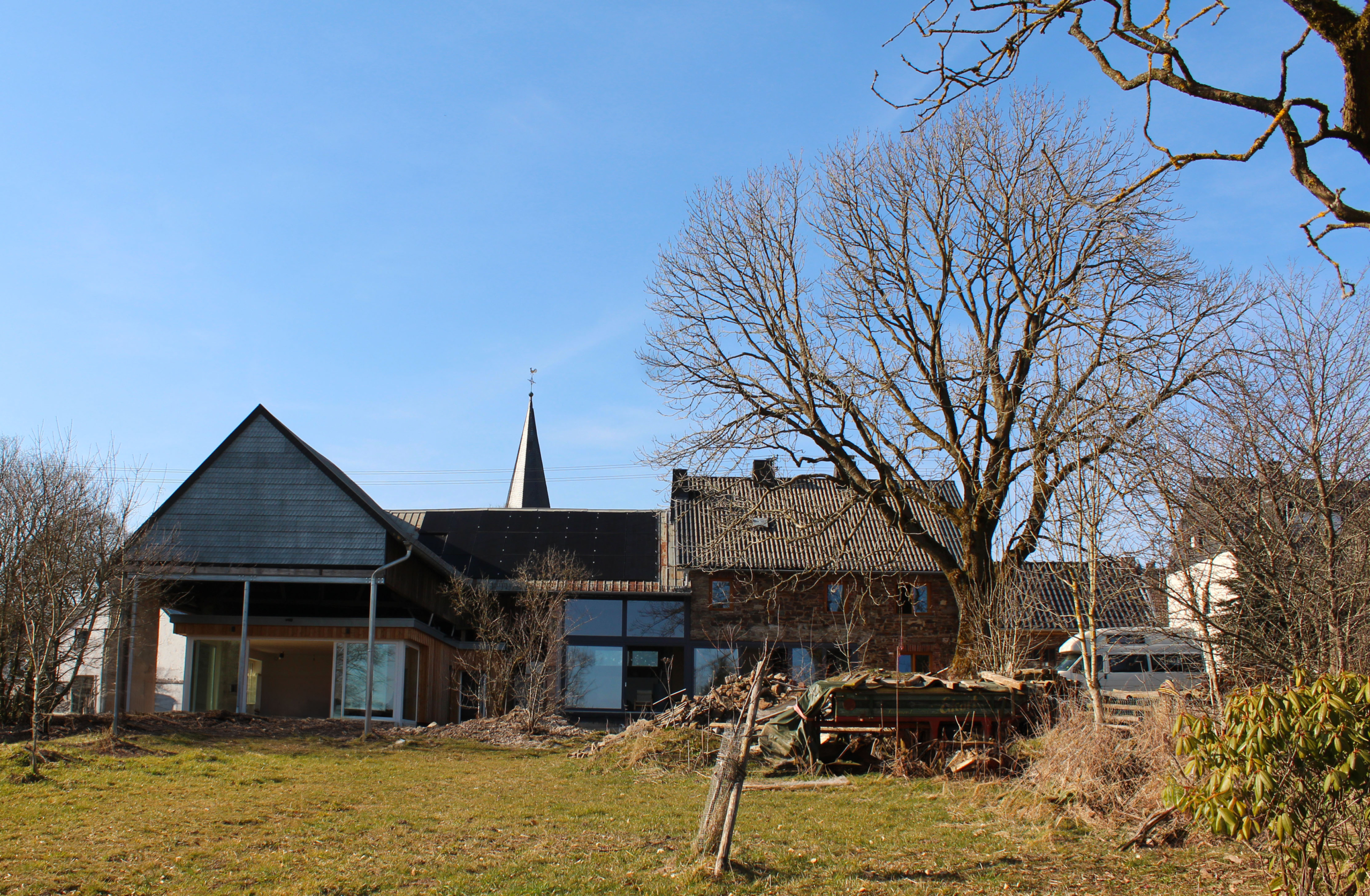 Ein Teil der rückwärtigen Fassade des Haupthauses wird aufgebrochen und ein Durchbruch zum angrenzenden Scheunenraum geschaffen. So entsteht zusätzlicher Wohnraum. Mit einer großzügigen Verglasung kann ein ungehinderter Blick auf die abfallende Landschaft inszeniert, und eine großzügige Verbindung zum Hof und dessen Herzstück, der alten Esche, geschaffen werden.