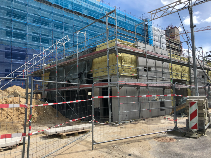 Da das Gebäude der bestehenden Sprinklerzentrale, sowie der Rest des Klinikums, unter Denkmalschutz stehen, war es erforderlich den Neubau an den Bestand anzupassen.