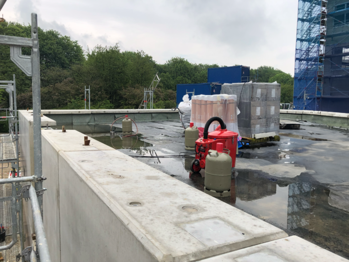 Um den erhöhten Brandschutzanforderungen des Universitätsklinikums Aachen gerecht zu werden, war der Neubau einer Wassernebel-Sprinklerzentrale notwendig. Diese ist auf dem Betriebshof des UKA, im Schatten des mehrgeschossigen Neubaus der Operativen Intensivmedizin (OIP), entstanden.