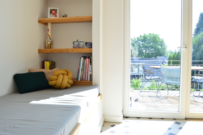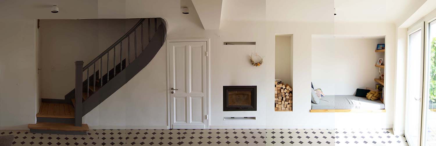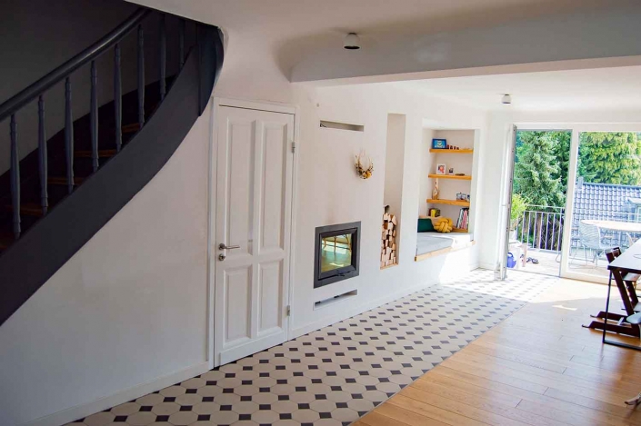 Mit viel Liebe zum Detail wurde ein Reihenhaus aus den 1920er Jahren umgebaut. Der Eingangsbereich erhielt eine gemütliche Sitznische mit Kamin, die Wärme und Atmosphäre schafft. Ein neuer Balkon verbindet das Haus über einen direkten Zugang mit dem Garten – eine gelungene Verbindung von Alt und Neu.